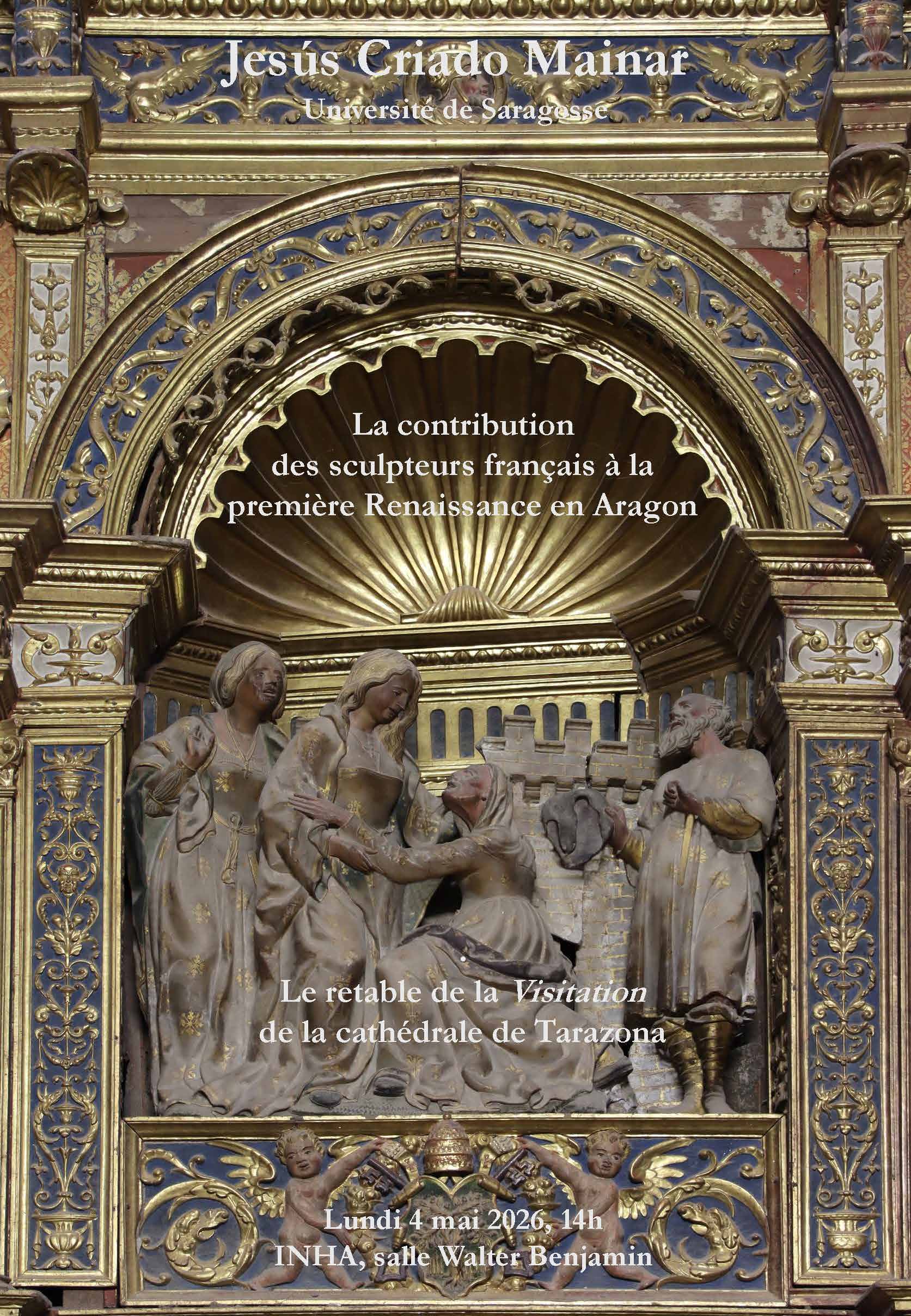 L’étude de cet ensemble unique, en pin et en albâtre, polychromé et doré, a permis d’approfondir le rôle joué par un grand nombre de sculpteurs français originaires de Normandie et de Picardie dans l’introduction du nouveau langage de la Renaissance en Aragon. Sa présentation par Jesús Criado Mainar, dans le cadre des séminaires à l’EPHE de Guy-Michel Leproux et Audrey Nassieu Maupas, sera l’occasion de réfléchir aux liens qui unissent le nord de la France à la vallée de l’Èbre à cette époque.