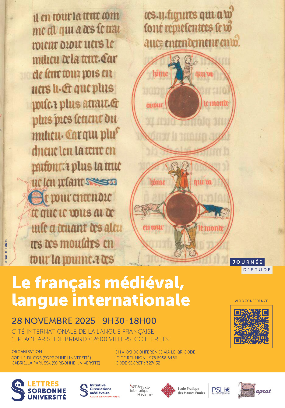 Ce sont donc ces aspects qui sont au centre de la journée d’étude : de l’Atlantique à la Méditerranée, de l’Angleterre, en passant par les Canaries et Chypre jusqu’au Proche Orient, comment le français est-il employé ? Quels sont les contacts et quelle influence le français a-t-il eu avec les autres langues ? En quoi et pourquoi le français apparaît-il comme une langue internationale au Moyen Âge ?