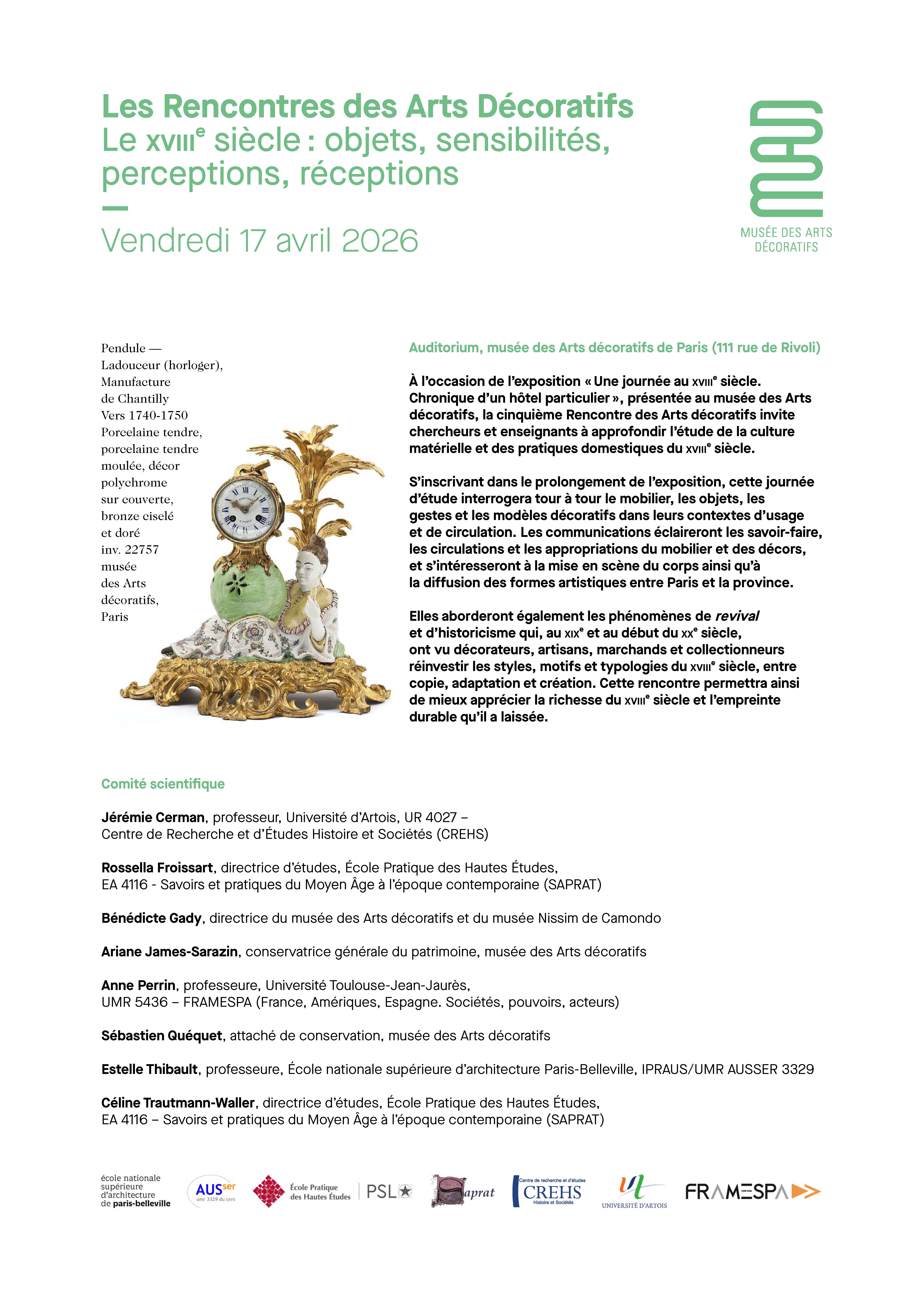 S’inscrivant dans le prolongement de l’exposition, cette journée d’étude interrogera tour à tour le mobilier, les objets, les gestes et les modèles décoratifs dans leurs contextes d’usage et de circulation. Les communications éclaireront les savoir‑faire, les circulations et les appropriations du mobilier et des décors, et s’intéresseront à la mise en scène du corps ainsi qu’à la diffusion des formes artistiques entre Paris et la province.